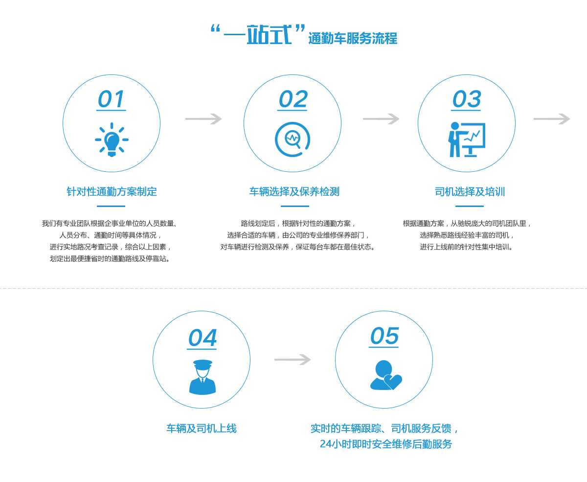 專業(yè)團(tuán)隊(duì)提供一站式針對(duì)性通勤方案,數(shù)量龐大多種類型車輛可供選擇,標(biāo)準(zhǔn)化培訓(xùn)的司機(jī)團(tuán)隊(duì)提供優(yōu)質(zhì)服務(wù), 24小時(shí)響應(yīng)客服及安全維修應(yīng)急班組保您沒有后顧之憂。